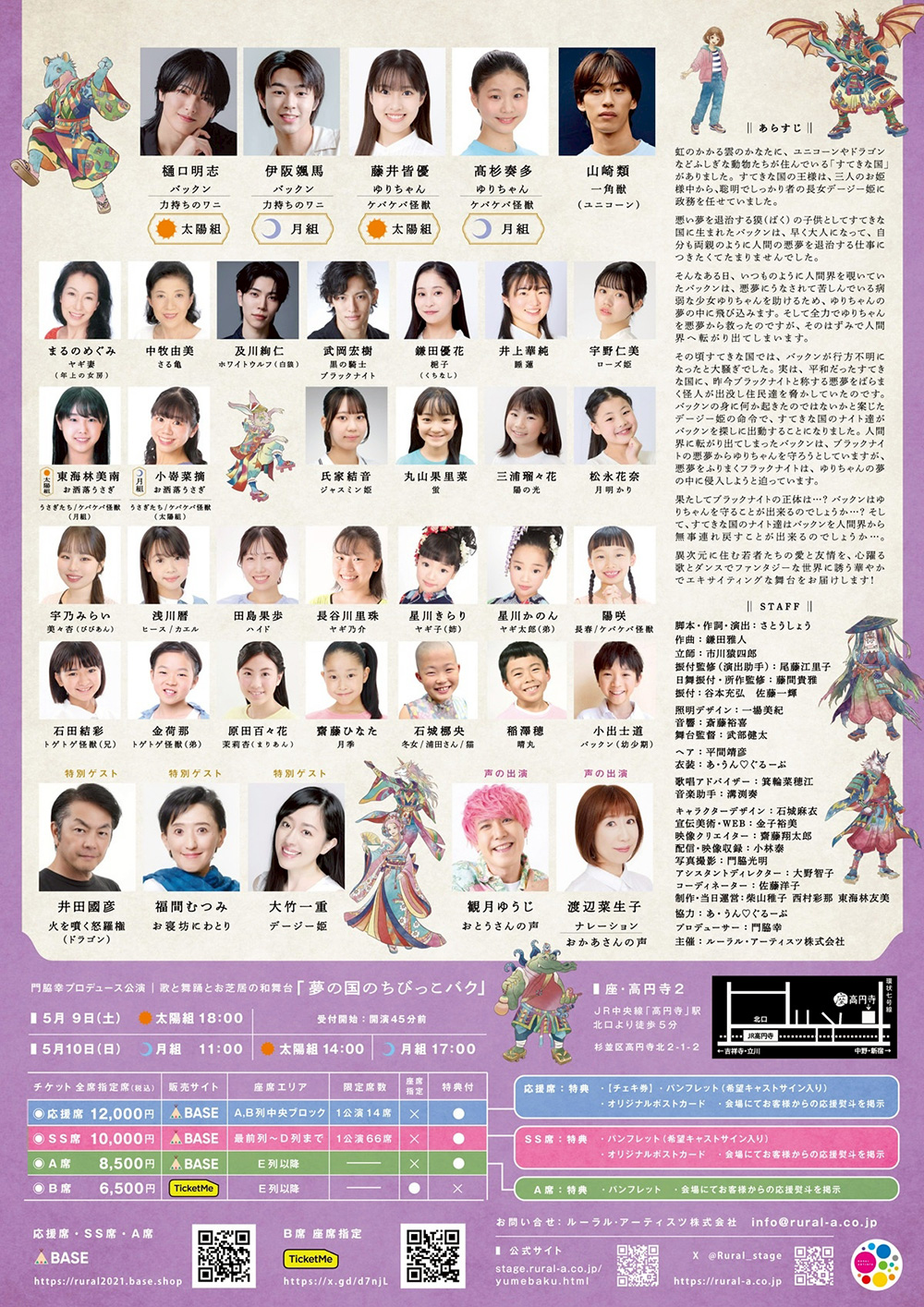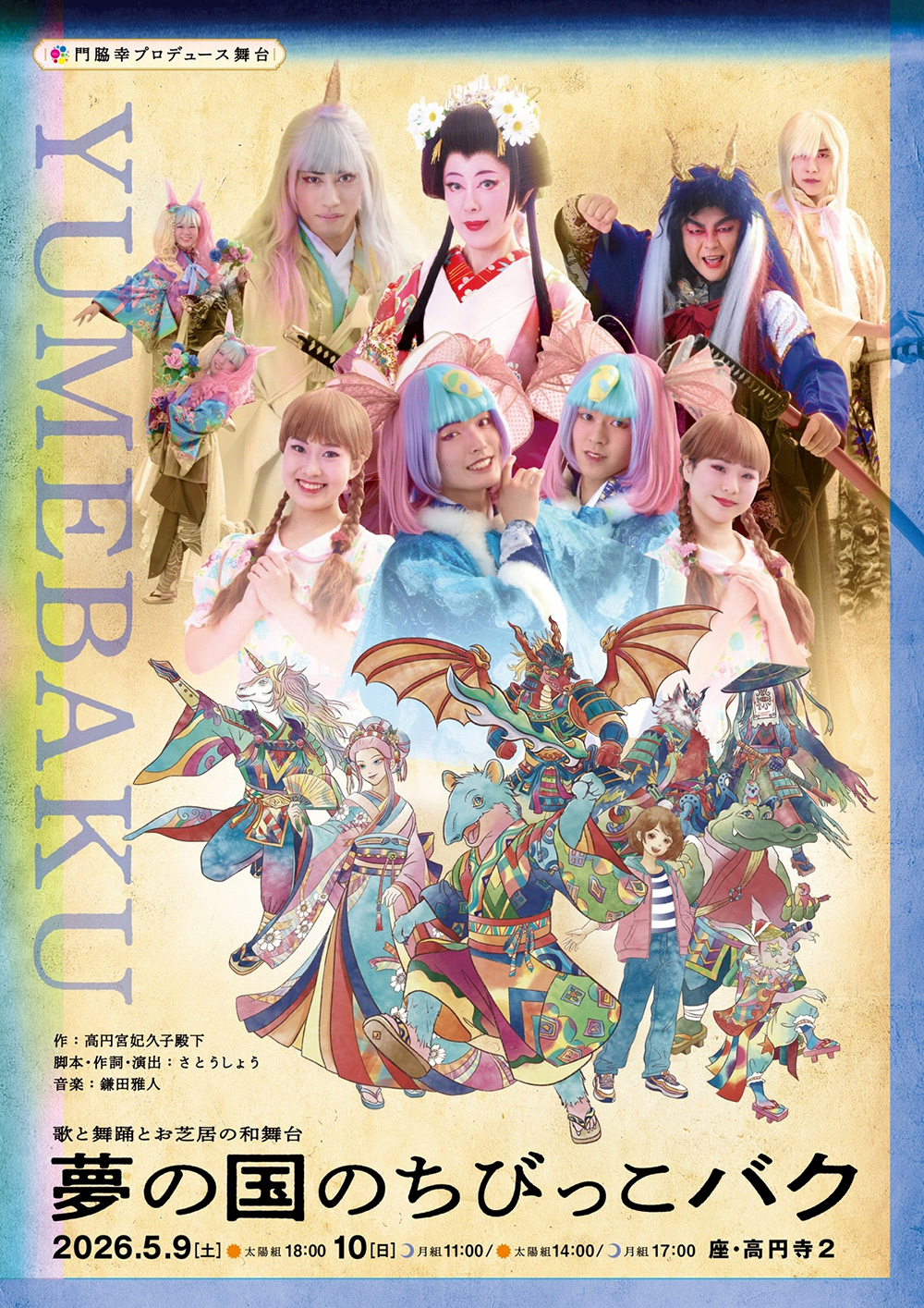 2026年3月31日 舞台「夢の国のちびっこバク」 門脇幸プロデュース作:高円宮妃久子殿下歌と舞踊とお芝居の和舞台舞台「夢の国のちびっこバク」脚本・作詞・演出:さとうしょう音楽:鎌田雅人■ 日時:2026年5月9日[土] 〜10日[日] 全4公演■ 劇場:座・高円寺2■ 主催:ルーラル・アーティスツ株式会社<スケジュール>◉ 2026年5月9日[土] 太陽組 18:00(受付 17:00)◉ 2026年5月10日[日] 月組 11:00(受付 10:00) 太陽組 14:00(受付 13:00) 月組 17:00(受付 16:00)<ご予約・詳細>https://stage.rural-a.co.jp/yumebaku.html 前の記事渡辺菜生子語り芝居 宮部みゆき原作「おそろし」